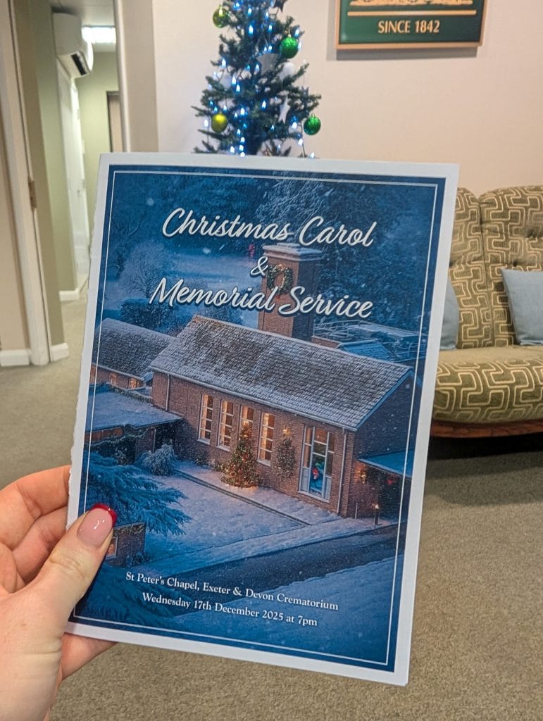 ExeterNewsExeter Christmas Memorial ServiceExeter Christmas Memorial Service This week, Neil and Jo from our Exeter branch attended the Christmas carol service organised by Exeter and Devon Crematorium.It was a wonderful event with a great turnout, and a truly lovely service, brought together by a range of celebrants and funeral directors.We were pleased to supply the orders of service for the occasion, designed by our in-house graphics team.