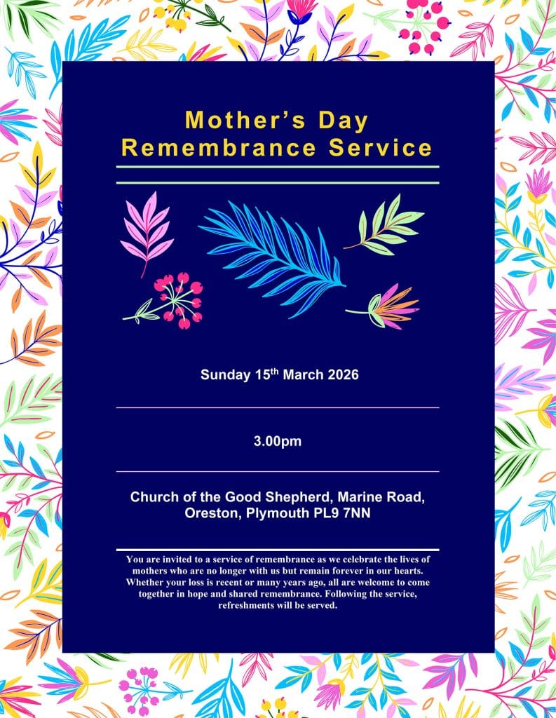 NewsMother’s Day Remembrance ServiceMother’s Day Remembrance Service A Mother’s Day Remembrance Service will take place on Sunday 15th March at The Church of The Good Shepherd, Marine Road, Oreston. There will be prayers, hymns, readings, music and poetry, and the opportunity to light a candle in memory of our mothers who are no longer with us. Whether your loss is recent or many years ago, all are welcome to come together in hope and shared remembrance. Light refreshments will be served afterwards in the Church Hall. 📍 The Church of The Good Shepherd, Marine Road, Oreston, Plymouth PL9 7NN 📆 Sunday, 15th March 2026🕒 3.00pm